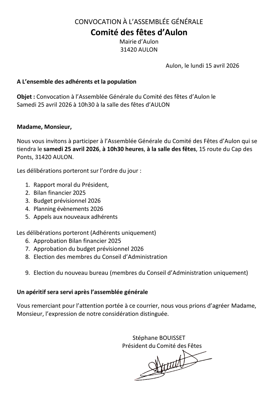Vous êtes invités à l'assemblée générale du Comité des Fêtes