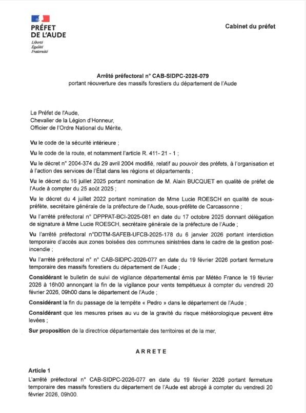 🌳 En conséquence, les massifs forestiers peuvent à nouveau accueillir du public à l’exception des Zones boisées des communes sinistrées par l'incendie de Ribaute qui demeurent strictement interdits d’accès pour des raisons évidentes de sécurité.