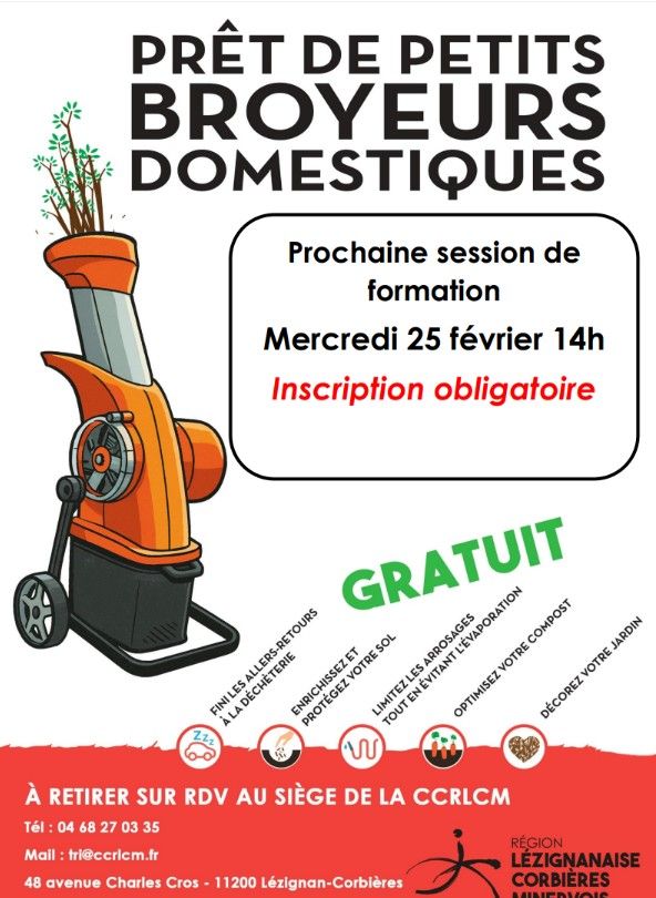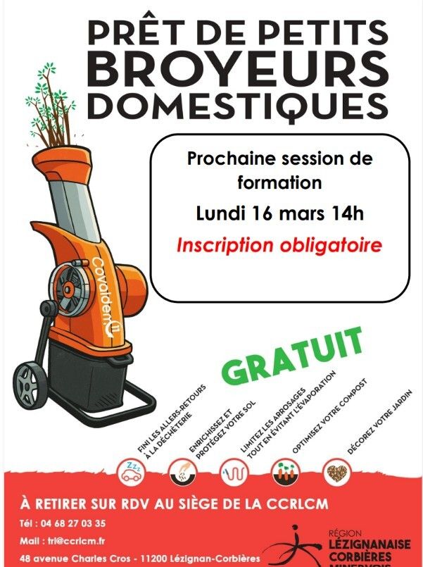 Session de formation gratuite pour le prêt du broyeur domestique électrique, elle se déroulera le lundi 16 mars 2026 à 14h00 dans les locaux de la CCRLCM. Inscription obligatoire.