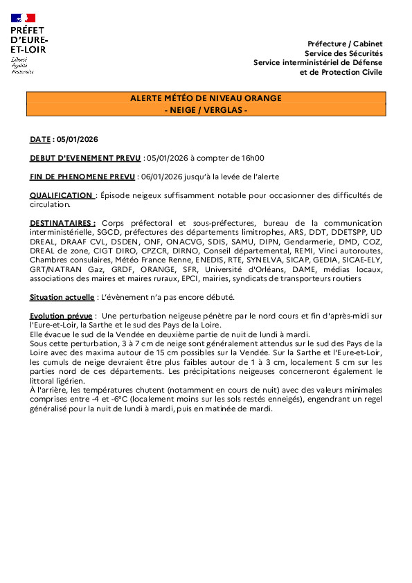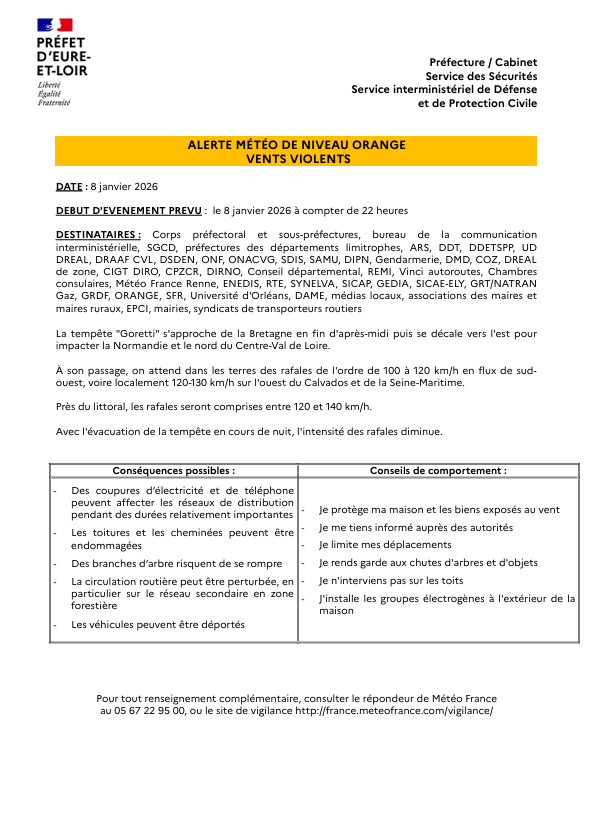 Le département d'Eure-et-Loir est placé en vigilance météorologique ORANGE