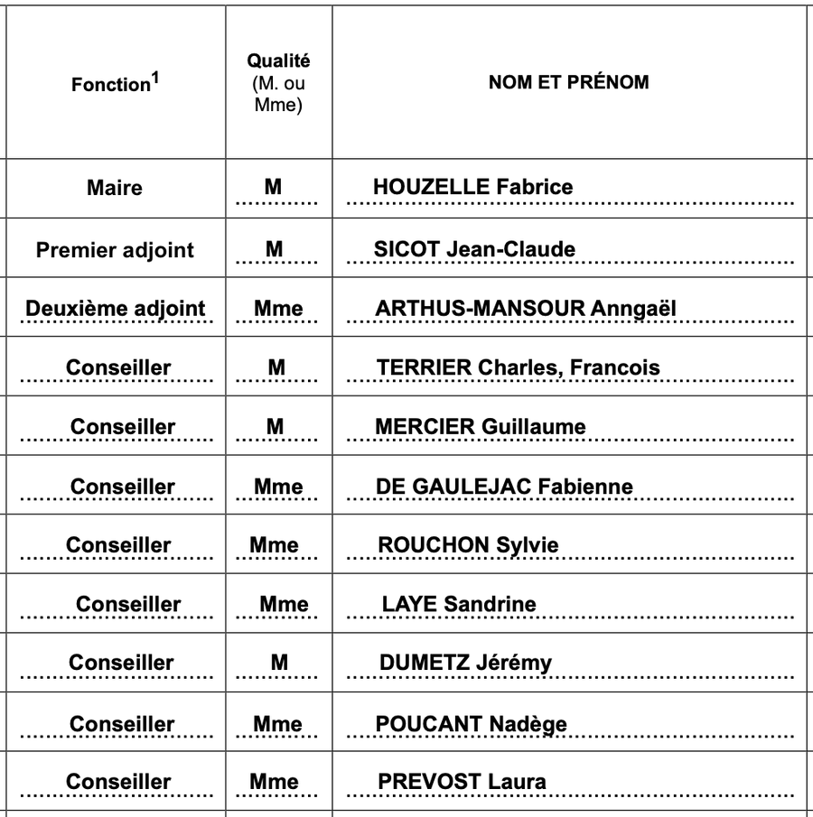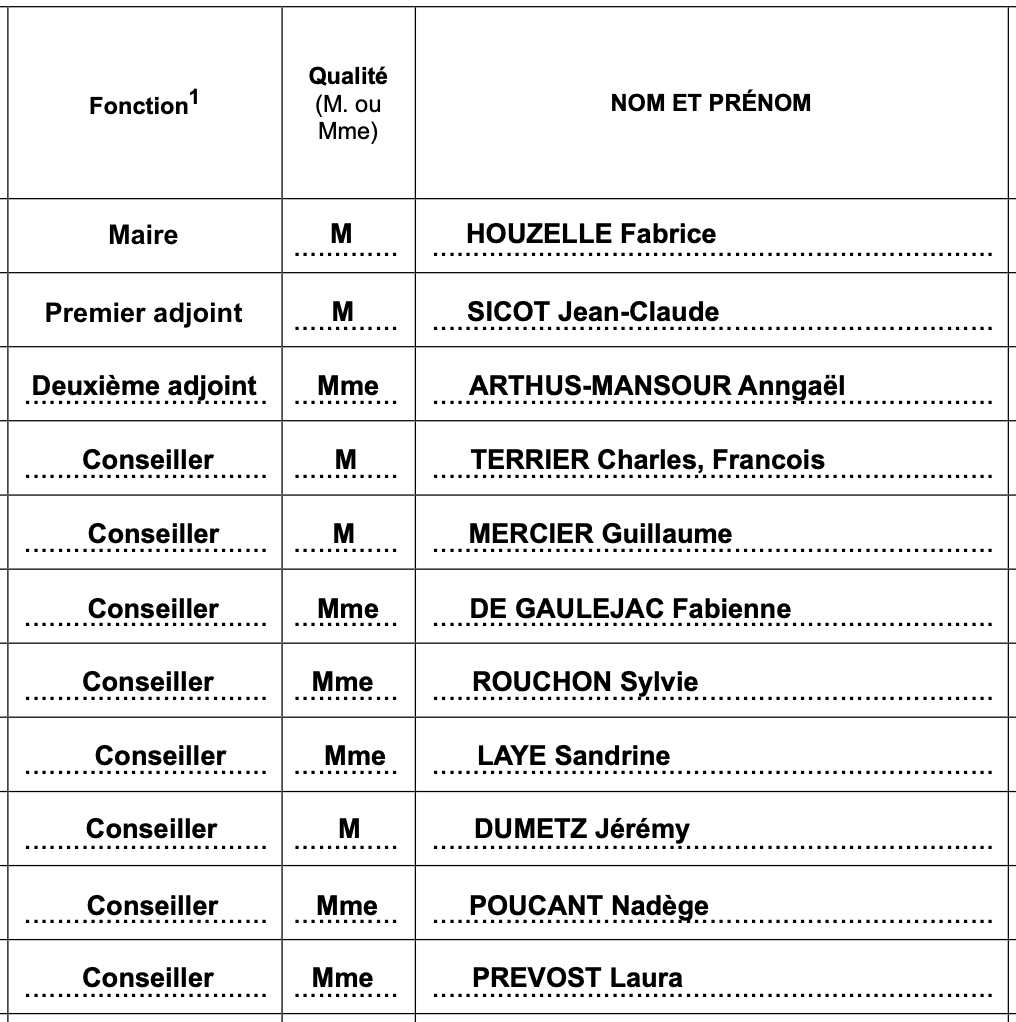 Je vous prie donc de trouver un extrait du tableau du conseil municipal ci-dessous.