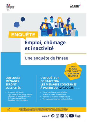 L’Institut national de la statistique et des études économiques (Insee) réalisera une importante enquête statistique sur l’emploi, le chômage et l’inactivité sur notre commune lundi de la semaine prochaine, pour une durée de quatre semaines complètes : une première semaine de repérage / prise de contact, suivie de trois semaines de collecte.