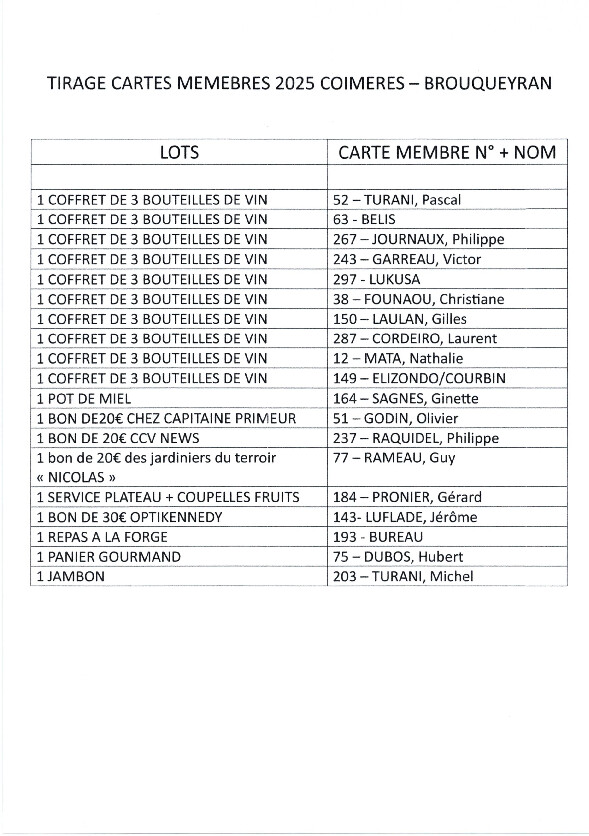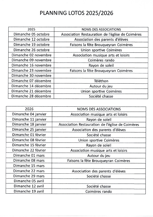 Veuillez trouver le planning des lotos organisés à la salle des fêtes de Coimères pour 2025/2026