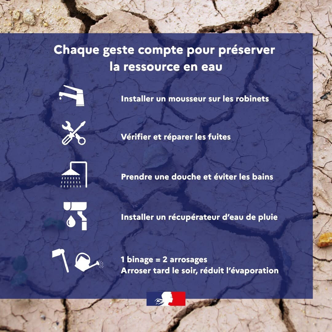 💧Tous les usagers sont appelés à diminuer leurs consommations d’eau potable ainsi que leurs prélèvements dans le milieu naturel.