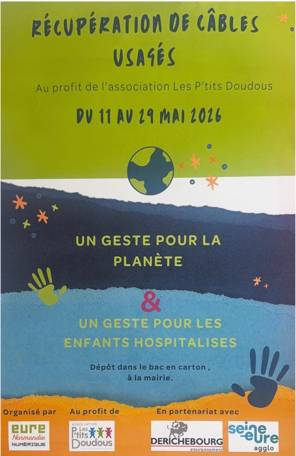 Du 11 au 29 mai, vous pourrez déposer à l'école ou en mairie : câbles informatiques, telecom, vidéos, souris, écouteurs....usagés.