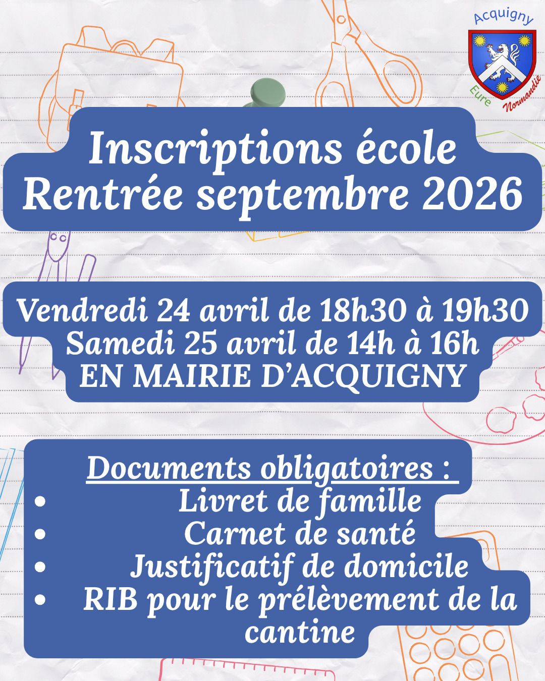 Pour inscrire vos enfants à l'école d'Acquigny, rendez-vous en mairie :