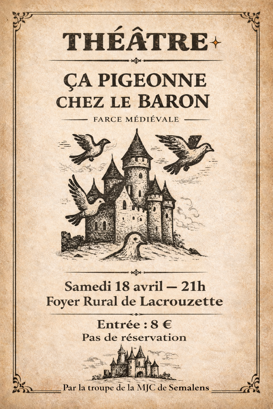 "Comment la Baronnie retrouvera t’elle son lustre d’antan ? Jeanne devrait-elle laisser son amour pour le bien-être des finances de son père ? Laissez- vous embarquer dans cette comédie intemporelle où les situations du Moyen Age se mélangent avec celles du XXIe siècle."