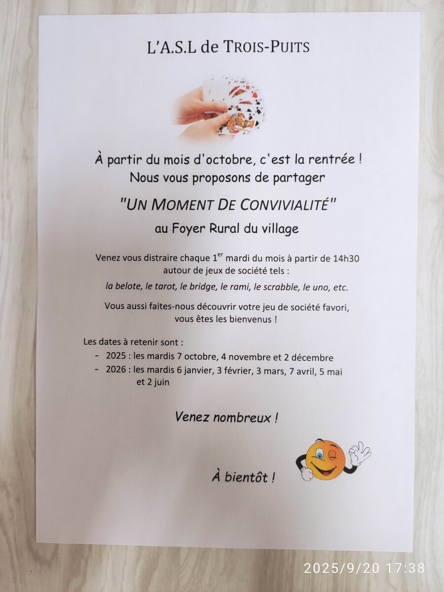 A partir du 7 octobre l'ASL vous propose des divertissements à la salle polyvalente.