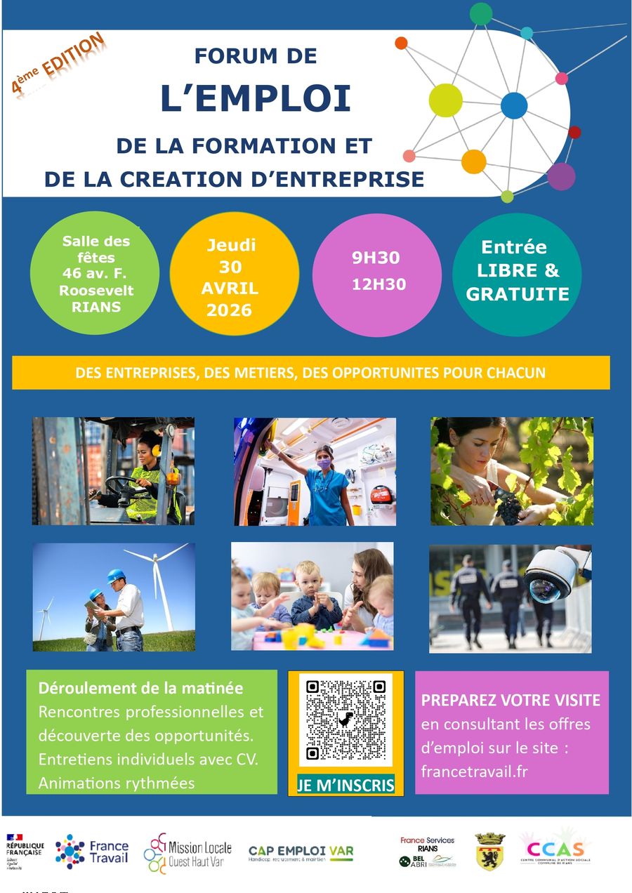 L’Agence France Travail de Saint-Maximin, la Mission Locale Ouest Haut Var, Cap Emploi, Bel Abri de la Maison France Service et le CCAS de Rians coorganisent la 4ème Édition du Forum de l'Emploi, de la Formation et de la Création d'Entreprise.