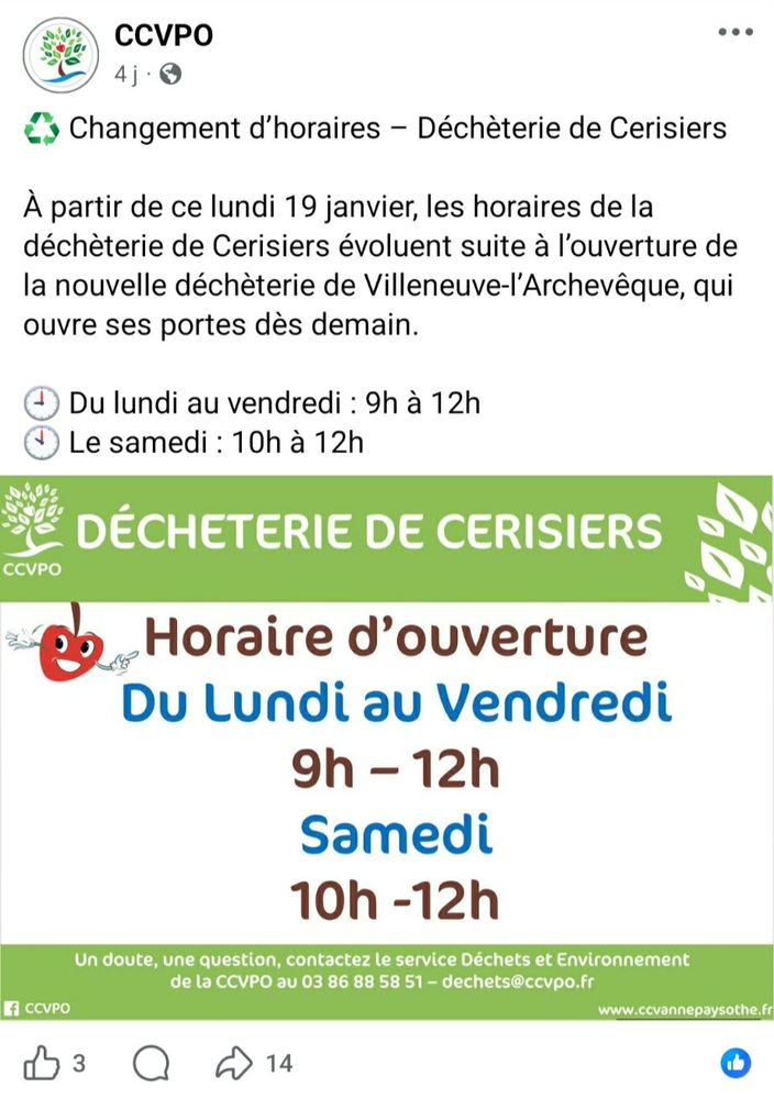 Nous avons le plaisir de vous annoncer la réouverture de la déchèterie de Villeneuve l'Archevêque en date du Samedi 17 janvier 2026 à 14h.