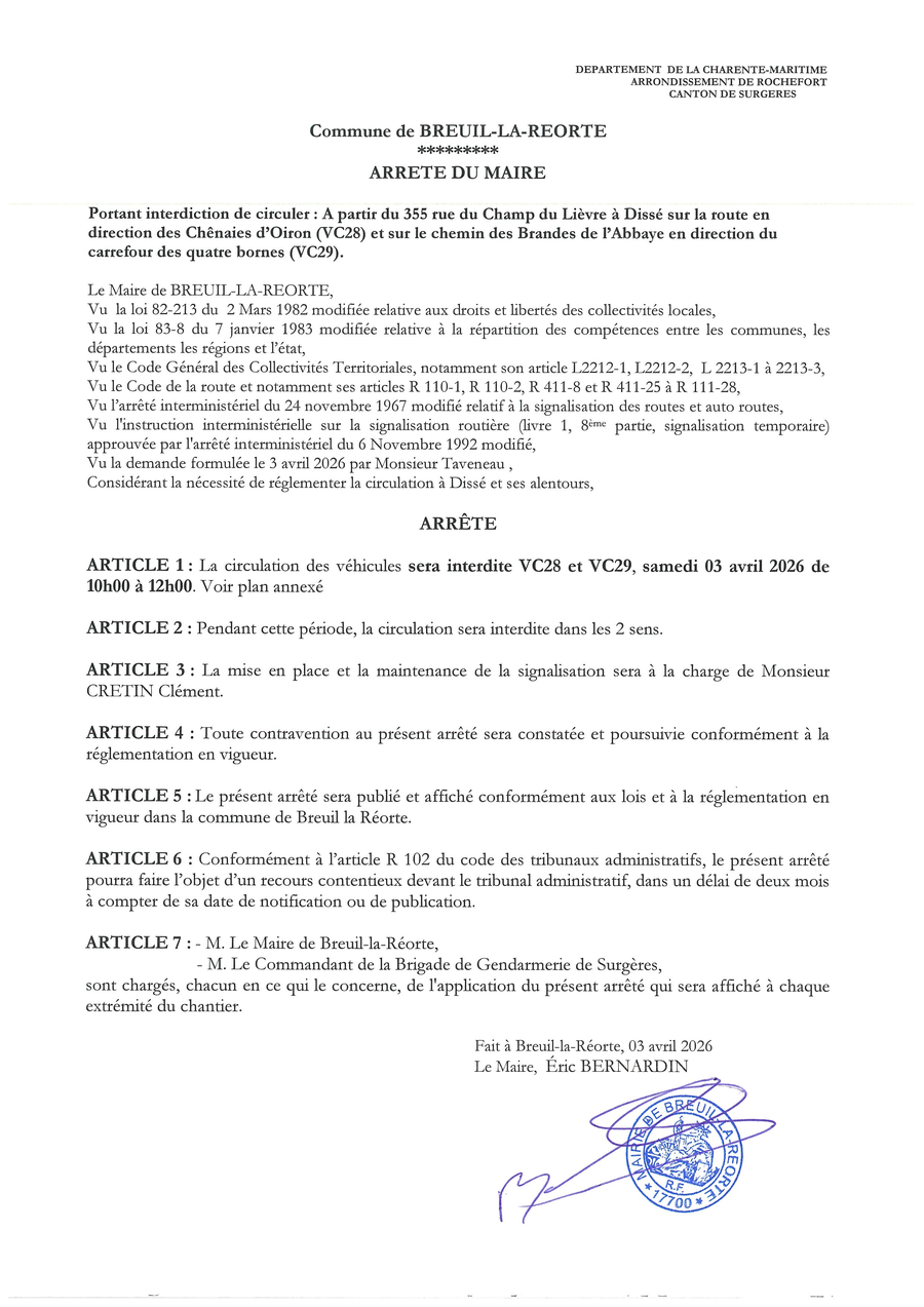La route qui part de Dissé (Rue du champ du lièvre) vers le carrefour des quatre bornes (vers Vandré) sera interdite à la circulation samedi 4 avril de 10h00 à 12h00