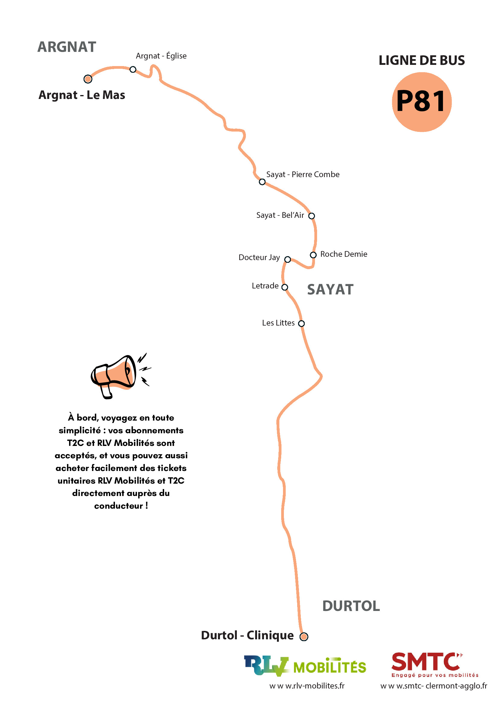 Sur la base de la restructuration du rĂ©seau de transports de la MĂ©tropole, les travaux sont en cours entre RLV MobilitĂ©s et le SMTC-AC afin dâimaginer la future desserte de Sayat. Il sâagira probablement dâune connexion Ă la ligne T2C la plus proche, certainement Ă Durtol avec la ligne C ou la ligne 10. Mais pour lâheure, il ne sâagit que dâune hypothĂšse de travail.