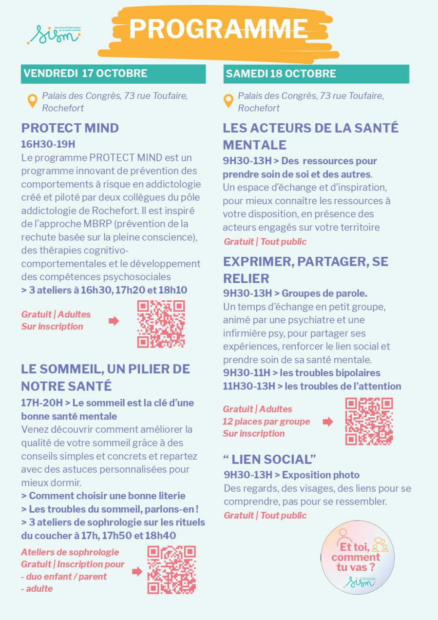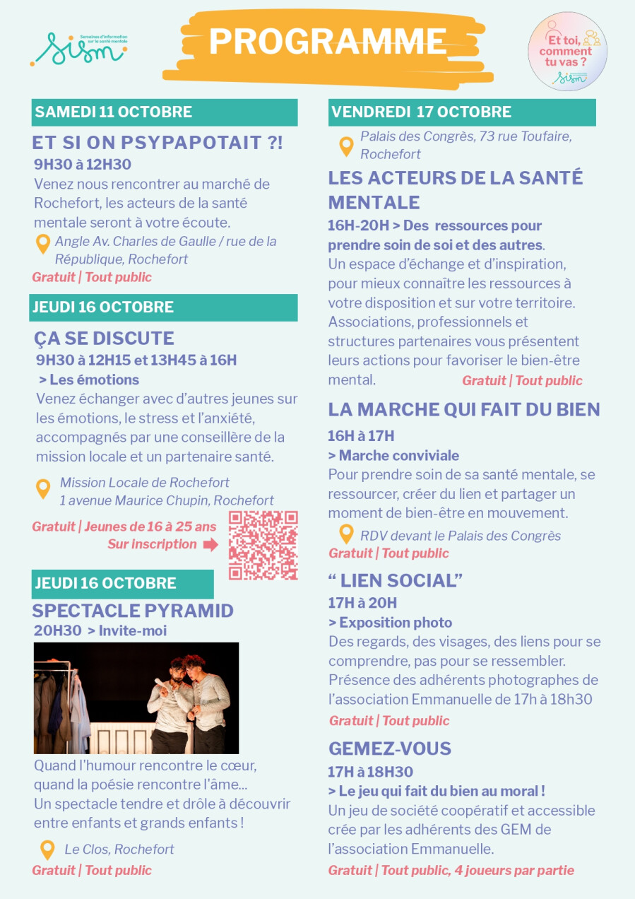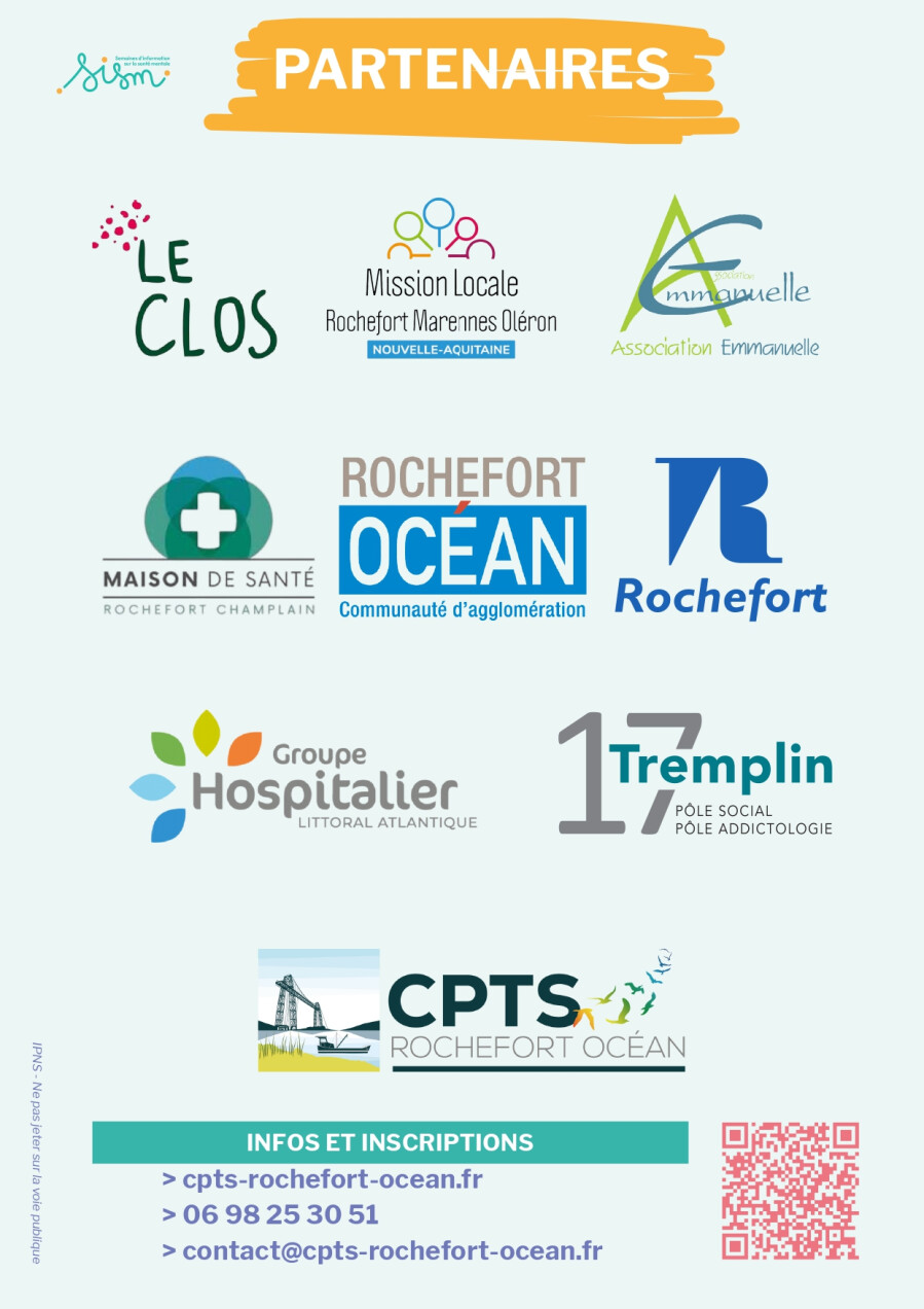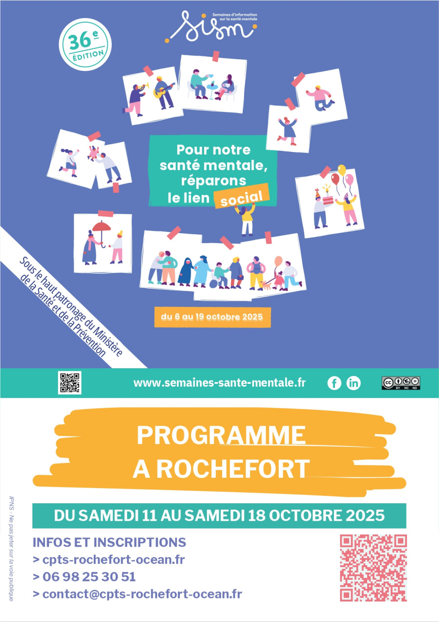 La Communauté Professionnelle Territoriale de Santé Rochefort Océan, la Communauté d’Agglomération Rochefort Océan et leurs partenaires vous invitent à venir partager des moments conviviaux dans le cadre de la 36ème édition des Semaines d'Information sur la Santé Mentale placée sous le thème « Pour notre santé mentale, réparons le lien social ».