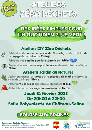 Ci-joint l'affiche pour des ateliers "Zéros déchets" et "Jardins au Naturel" qui se dérouleront à la