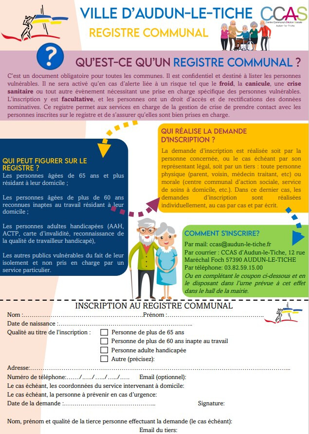 Si vous, un membre de votre famille, un voisin ou une connaissance souhaite apparaître sur ce registre, merci de prendre attache avec le CCAS de la ville (par téléphone ou en déposant le coupon-réponse joint dans l'urne prévue à cet effet dans le hall d'accueil).