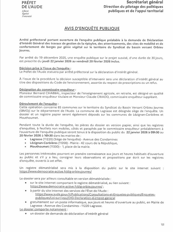 Avis d' ouverture de l'enquête publique préalable à la demande de Déclaration d'Intérêt Général des travaux de gestion