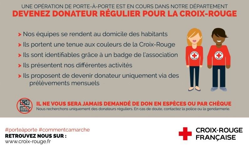 Mandatée par la Croix-Rouge française, notre équipe sera clairement identifiable par un badge et des vêtements aux couleurs de l’association.