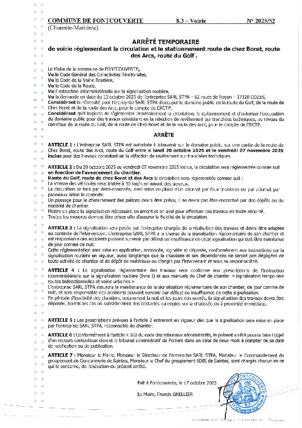 L’entreprise STPA, mandatée par ERCTP, interviendra pour des travaux consistant en la réfection de revêtement sur tranchées techniques du 20 octobre au 07 novembre 2025.