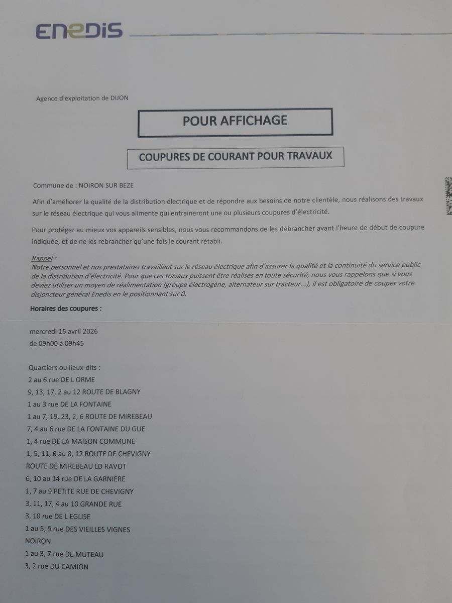 Mercredi 15 avril 2026 coupure de 9h à 9h45 voir fiche Enedis si dessous