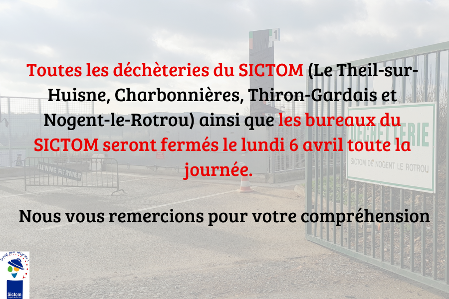 Également, toutes les déchèteries du SICTOM (Le Theil-sur-Huisne, Charbonnières, Thiron-Gardais et Nogent-le-Rotrou) et les bureaux du SICTOM seront fermés le lundi 6 avril toute la journée.