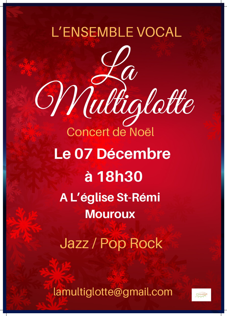 N'oubliez pas le concert de Noël, dimanche 7 décembre, église Saint Rémi à 18h30 par la Multiglotte, chorale de Mouroux, chansons Jazz / Pop Rock.