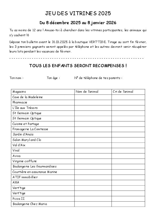 Remplissez votre bulletin de participation et déposez-le avant le 31 janvier à la boutique Vert’tige.