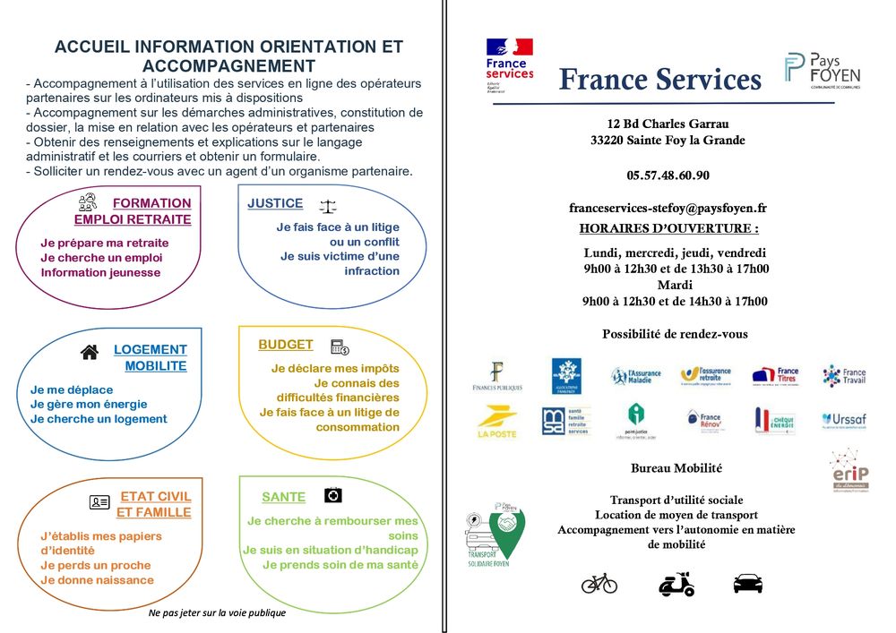 Jusqu'au 16 janvier 2026 : À France Services (Sainte-Foy-la-Grande). À partir du 19 janvier 2026 : Au nouveau siège de la CdC, 22 Avenue de Verdun à Sainte-Foy-la-Grande.