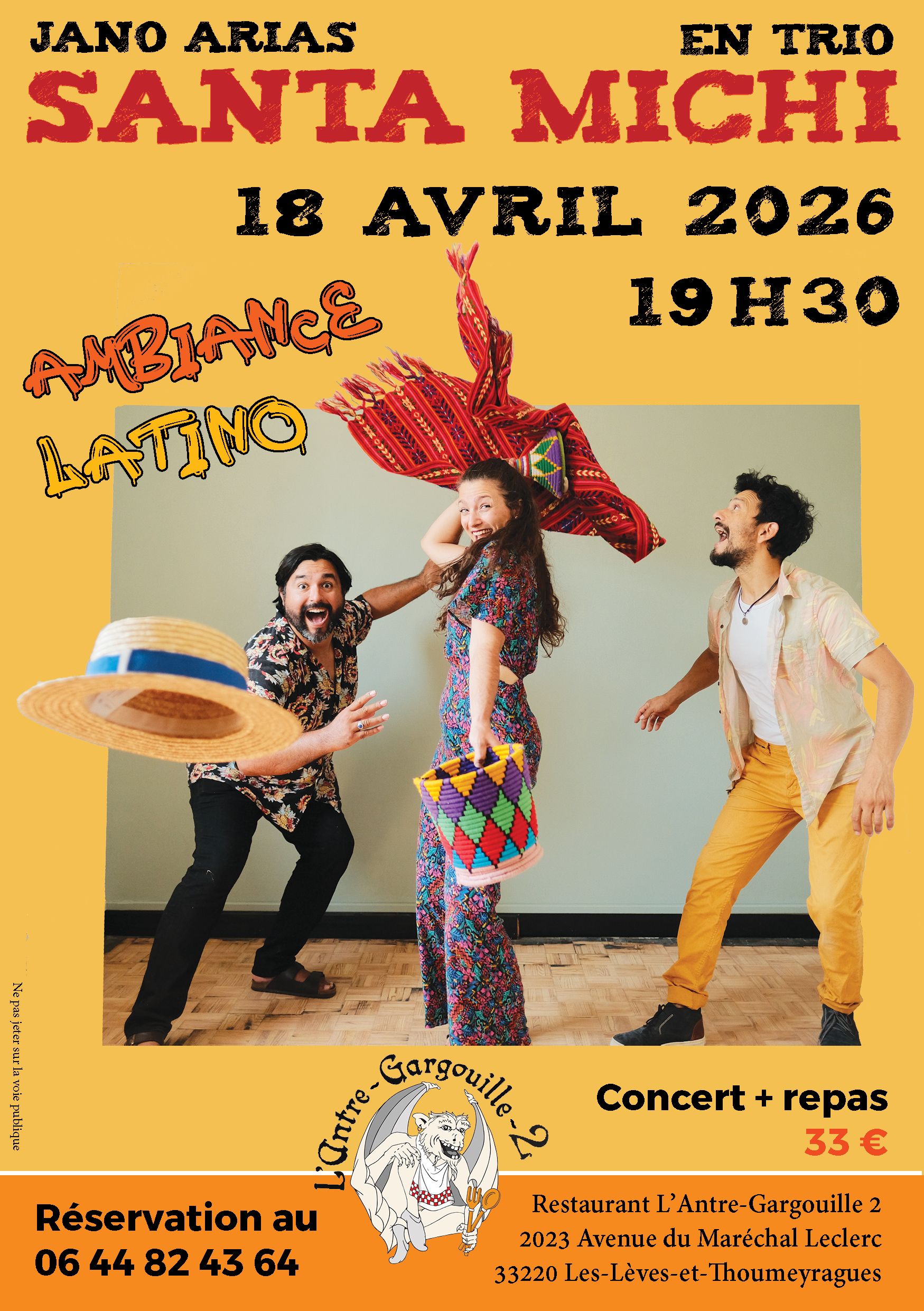 Le samedi 18 avril 2026 à 19h30, l’Antre-Gargouille 2 vous propose une soirée Dîner-Concert avec Jano Arias & Santa Michi.