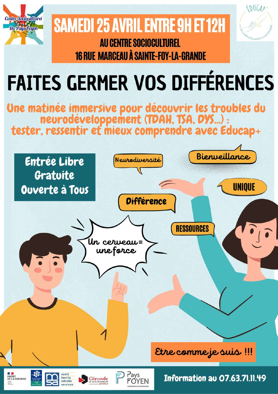 Nous souhaitons vous informer qu’une matinée d’immersion gratuite et ouverte à tous, dédiée à la compréhension des troubles neuro-développementaux aura lieu le samedi 25 avril de 9h à 12h au Centre Socioculturel.