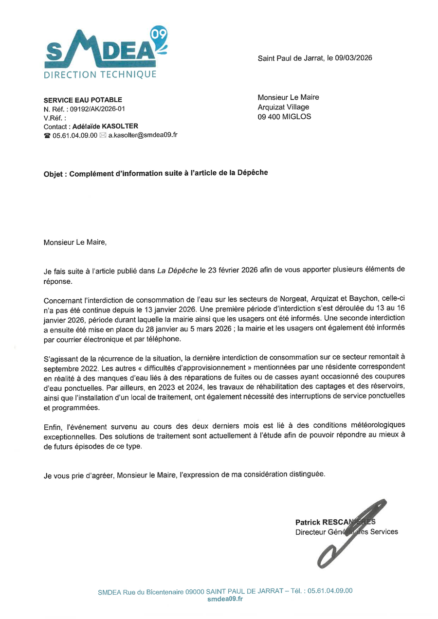 Suite à une analyse réalisée par le SMDEA, il s'avère que l'eau sur les villages de NORGEAT - ARQUIZAT - BAYCHON est impropre à la consommation (taux de turbidité élevé).