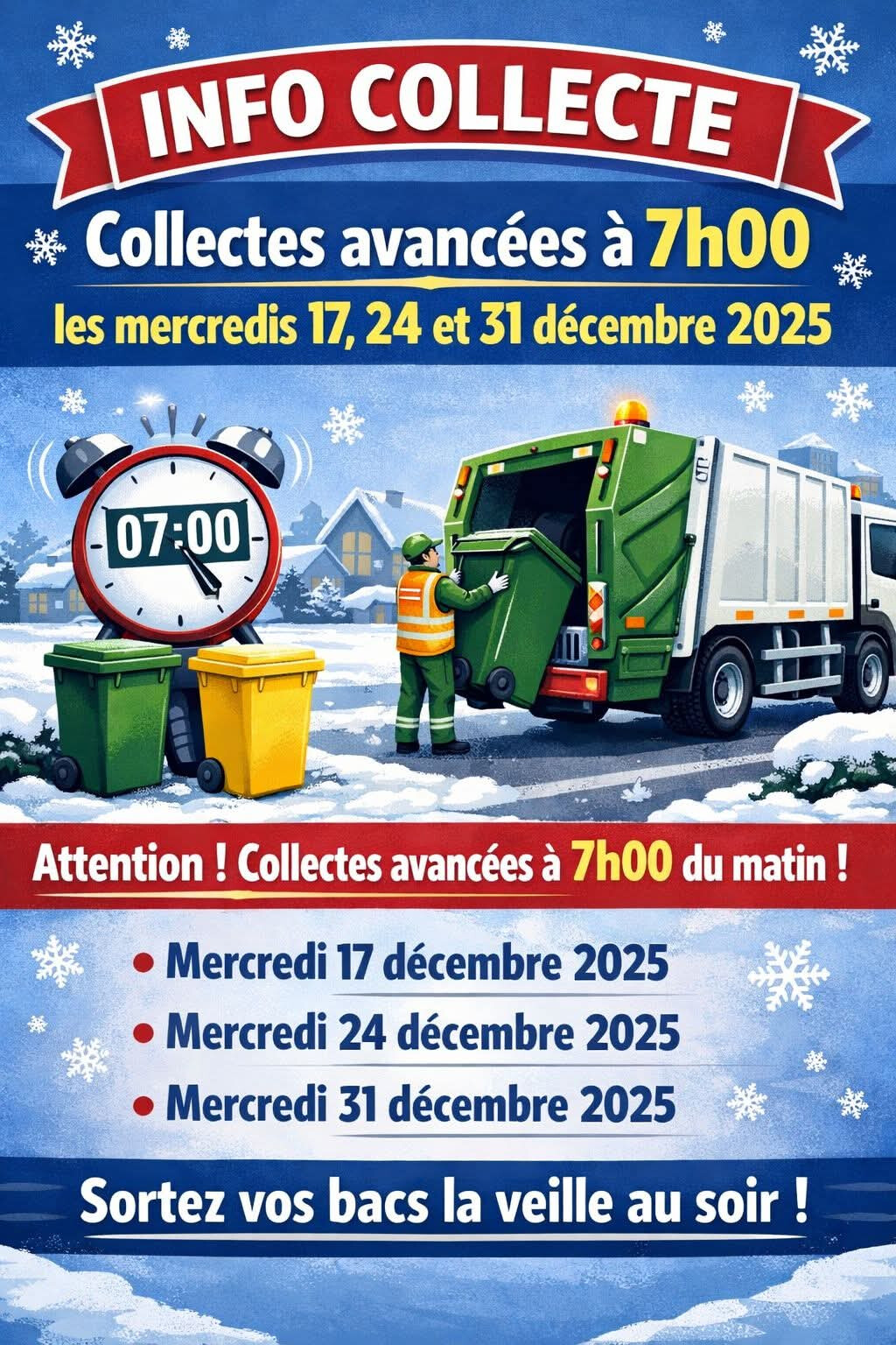 Pour des raisons de service, et en raison des festivités de fin d'année, les horaires de collecte des déchets du mercredi 17, 24 et 31 décembre vont être modifiés.