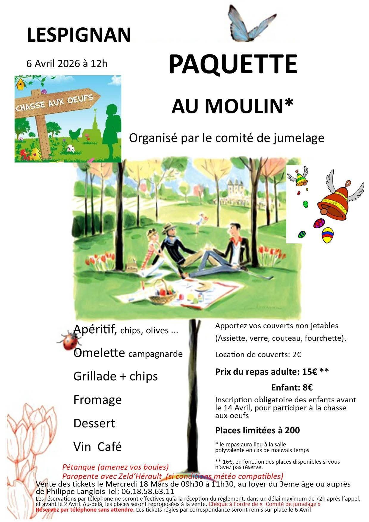 la traditionnelle fête de Pâquette organisée par le Comité de jumelage aura lieu le Lundi de Pâques 6 Avril au moulin Mauriçou de Lespignan. Vous pouvez réserver votre place au 06.18.58.63.11 ou par mail à cjlespignan@live.fr. Votre réglement devra parvenir dans les 72h au 2bis chemin des mounas 34710 LESPIGNAN pour valider votre réservation. Vous avez également la possibilité de venir acheter votre place le Mercredi 18 Mars entre 9h30 et 11h30, au foyer du 3eme âge, place de la poste.