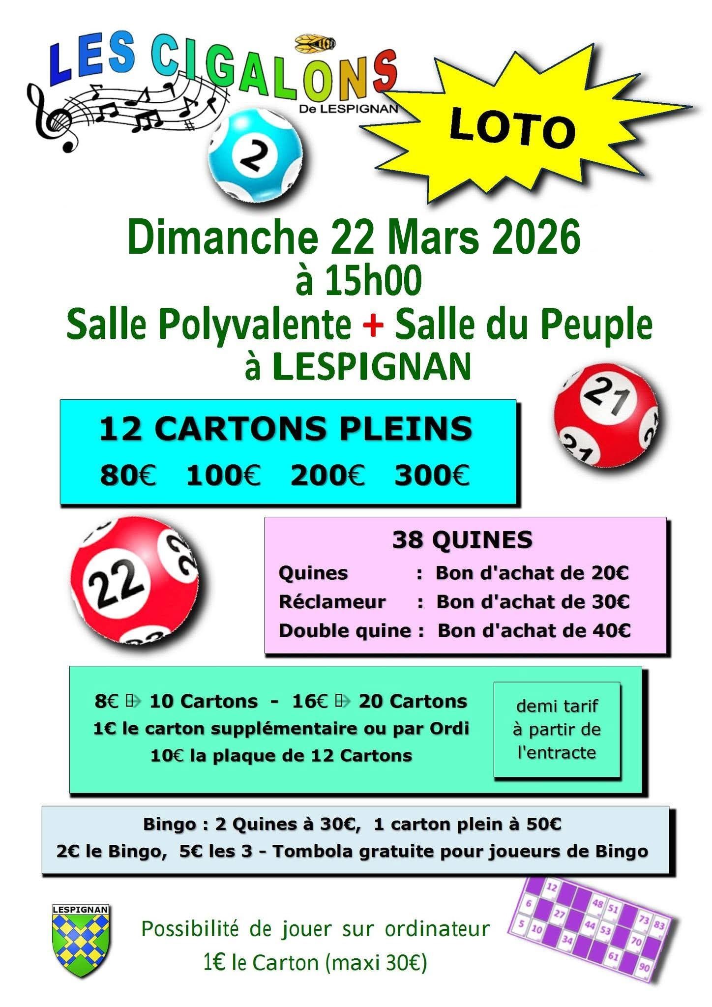 - Vendredi 6 mars: Loto à l'ancienne par les Amis de Lespignan 18h salle du Peuple