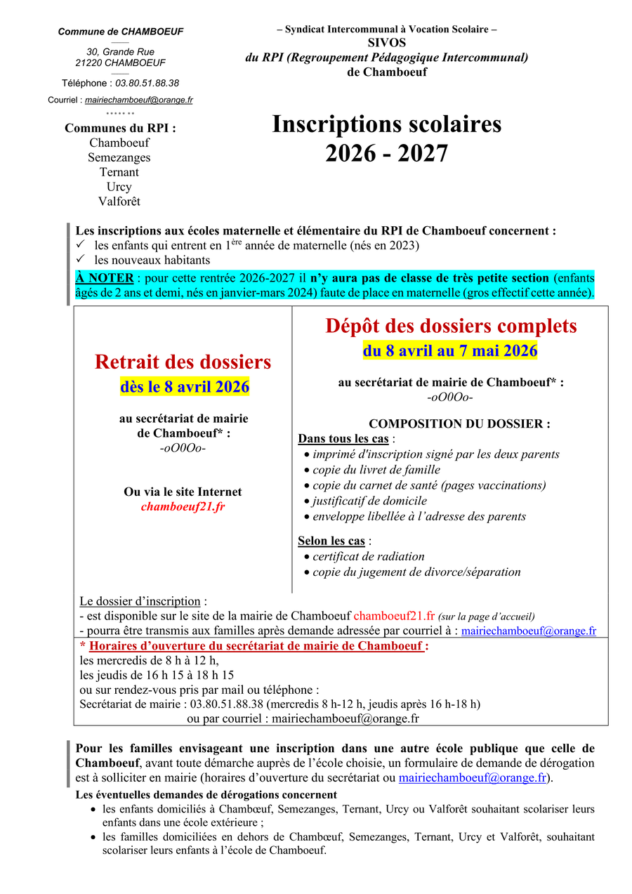 Les dossiers d'inscriptions aux Ă©coles maternelle et Ă©lĂ©mentaire du RPI de Chamboeuf, pour les enfants nĂ©s en 2023 et les nouveaux arrivants, doivent ĂȘtre dĂ©posĂ©s en mairie de Chamboeuf avant le jeudi 7 mai 2026.