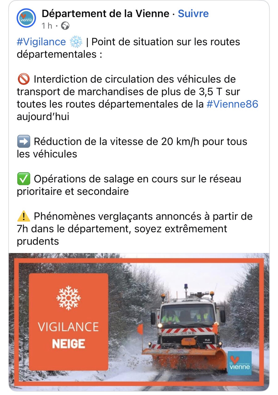 le département de la Vienne en vigilance orange pour le ou les phénomènes neige et verglas à compter de 06h00.