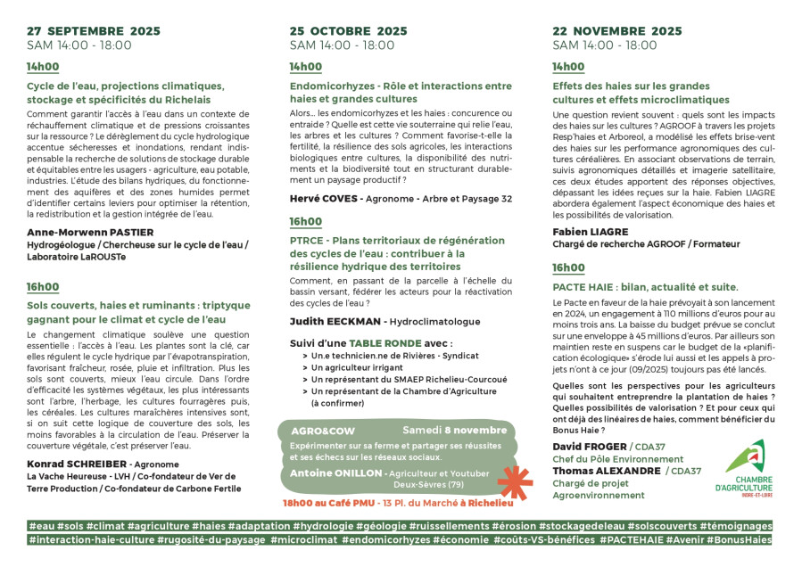 des après-midis de rencontres et d’échanges autour des thématiques eau, sols, climat, cultures et haies.