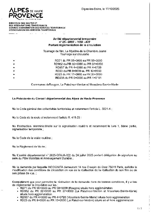 Portant règlementation de la circulation dans le cadre d'un tournage de film