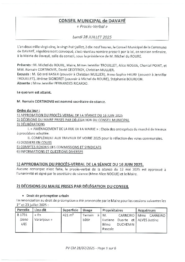 1) APPROBATION DU PROCÈS-VERBAL DE LA SÉANCE DU 28 JUILLET 2025