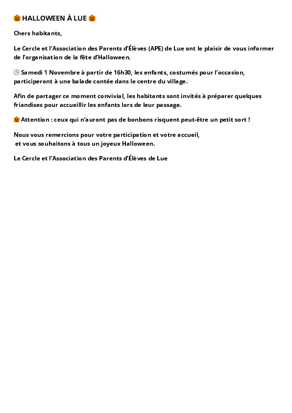 Un grand merci à tous les habitants de Luë qui ont ouvert leur porte et offert des bonbons aux enfants lors de la parade d’Halloween samedi soir ! Votre accueil chaleureux a fait le bonheur des petits monstres du village (et le désespoir des parents, qui ont dû frotter les dents un peu plus longtemps une fois la nuit venue !).