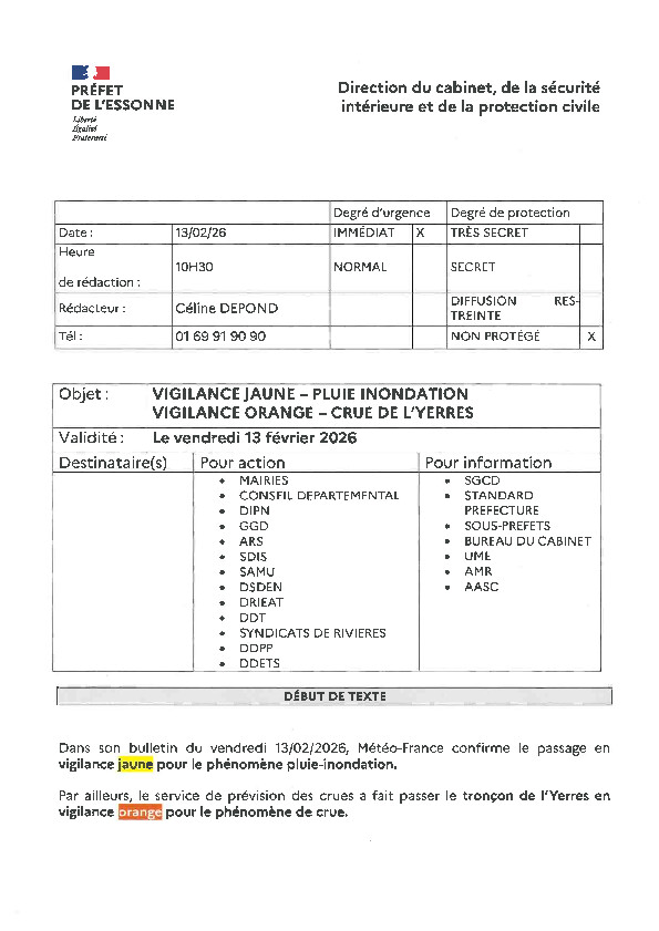 > Le passage en vigilance ORANGE pour le phénomène de crue sur le tronçon de l'Yerres.