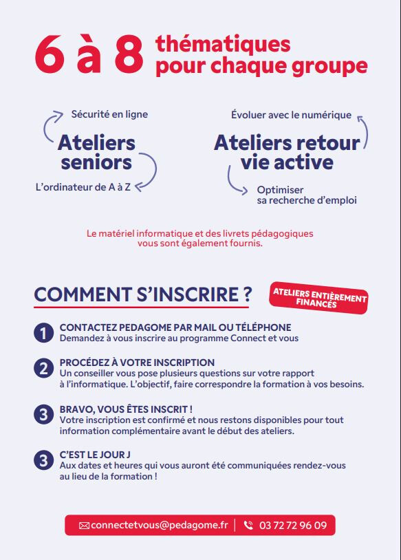 📞 Pour toutes inscriptions ou demande d’information concernant les ateliers, veuillez appeler Pedagome au numéro suivant : 03 72 72 96 09