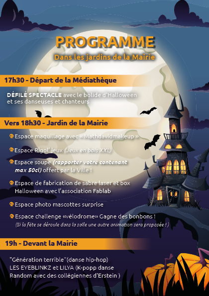 🎃17h30 : Défilé spectacle avec le bolide d’Halloween et ses danseuses et chanteurs