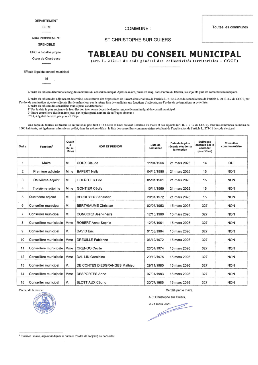 La liste conduite par Claude COUX Ensemble pour l'avenir de Saint Christophe sur Guiers a été élue dés le 1er tour.