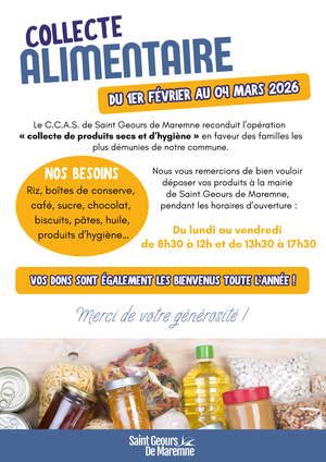 Le CCAS de St Geours de Maremne reconduit l'opération "collecte de produits secs et d'hygiène" en faveur des familles les plus démunies de notre commune.