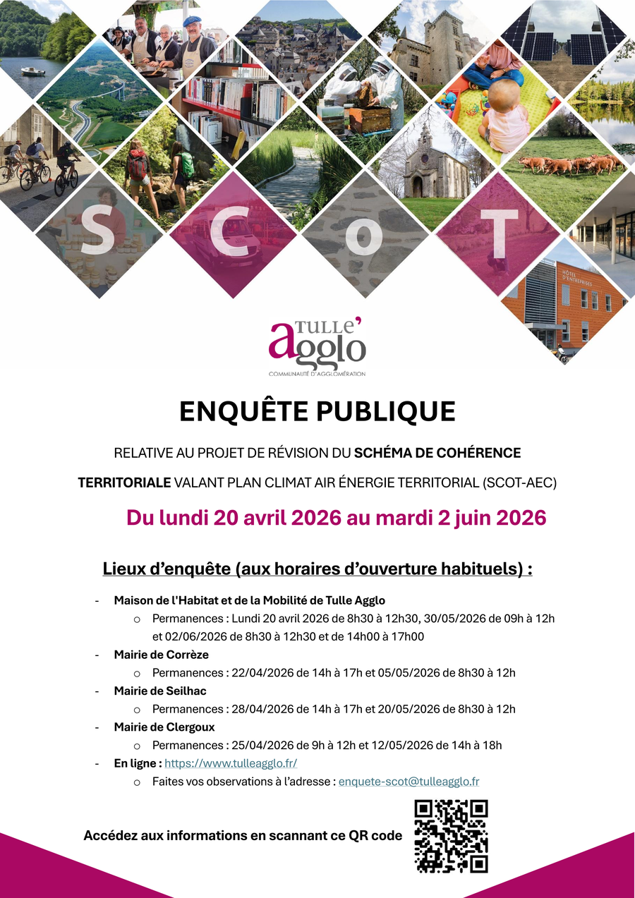 La commissaire enquêtrice se tiendra à disposition du public lors de permanences établies à la Maison de l'Habitat et la Mobilité à Tulle et aux mairies de Clergoux, Corrèze et Seilhac (cf. affiche ci-jointe).