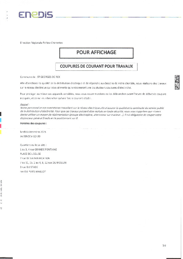 Pour répondre aux besoins de sa clientèle, ENEDIS a prévu de réaliser sur le réseau de distribution des travaux qui entraîneront une ou plusieurs coupures d’électricité