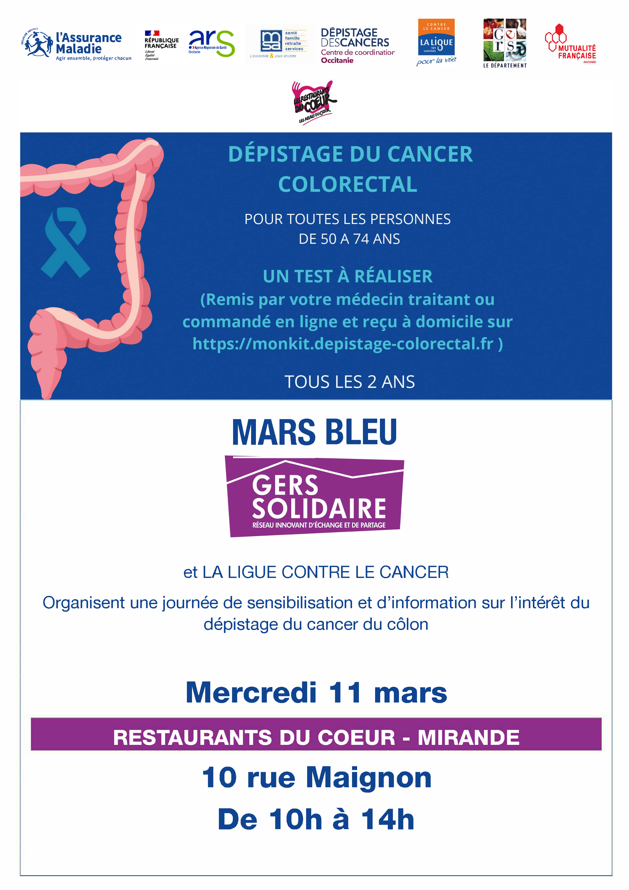Rendez-vous mercredi 11 mars pour une journée de sensibilisation et d'information sur le dépistage du cancer du côlon avec la ligue contre le cancer et Gers Solidaire !