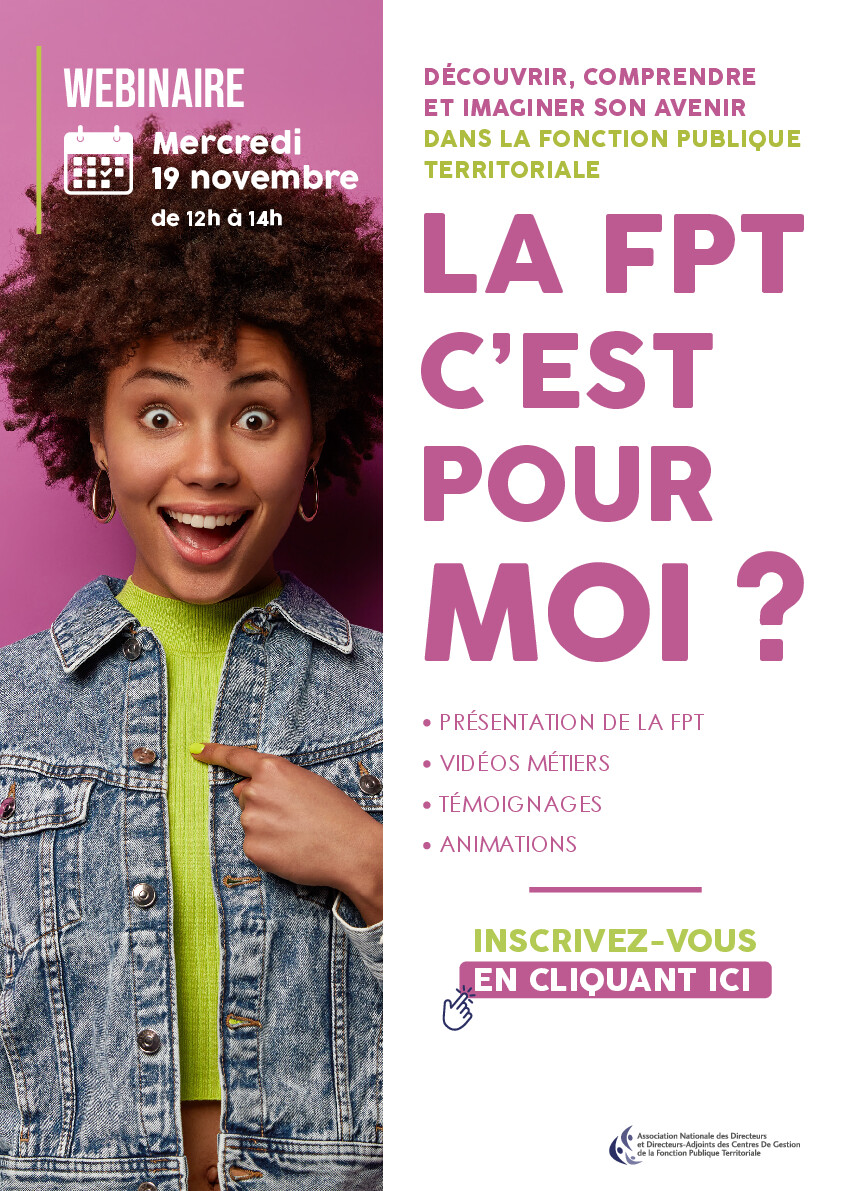 Organisé par l'ANDCDG, ce webinaire national a pour objectif de faire découvrir la richesse et la diversité des métiers de la FPT aux jeunes actuellement en formation (lycéens, étudiants, alternants, stagiaires.....) et de leur présenter les opportunités professionnelles offertes au sein des Collectivités Territoriales.