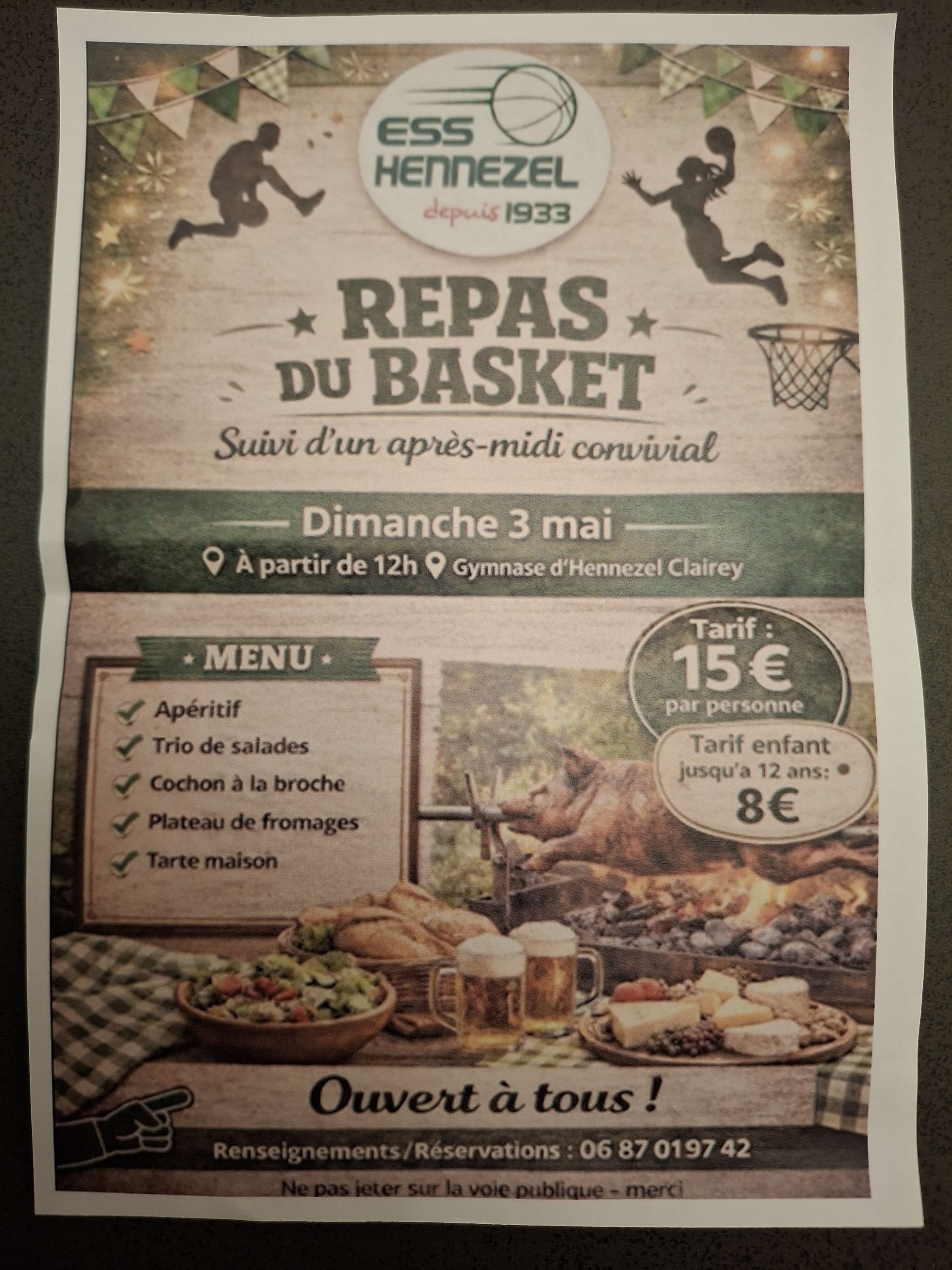 L'ESS HENNEZEL organise un "Repas du basket", suivi d'un après-midi convivial, le dimanche 03 mai à partir de 12 heures au gymnase de Clairey