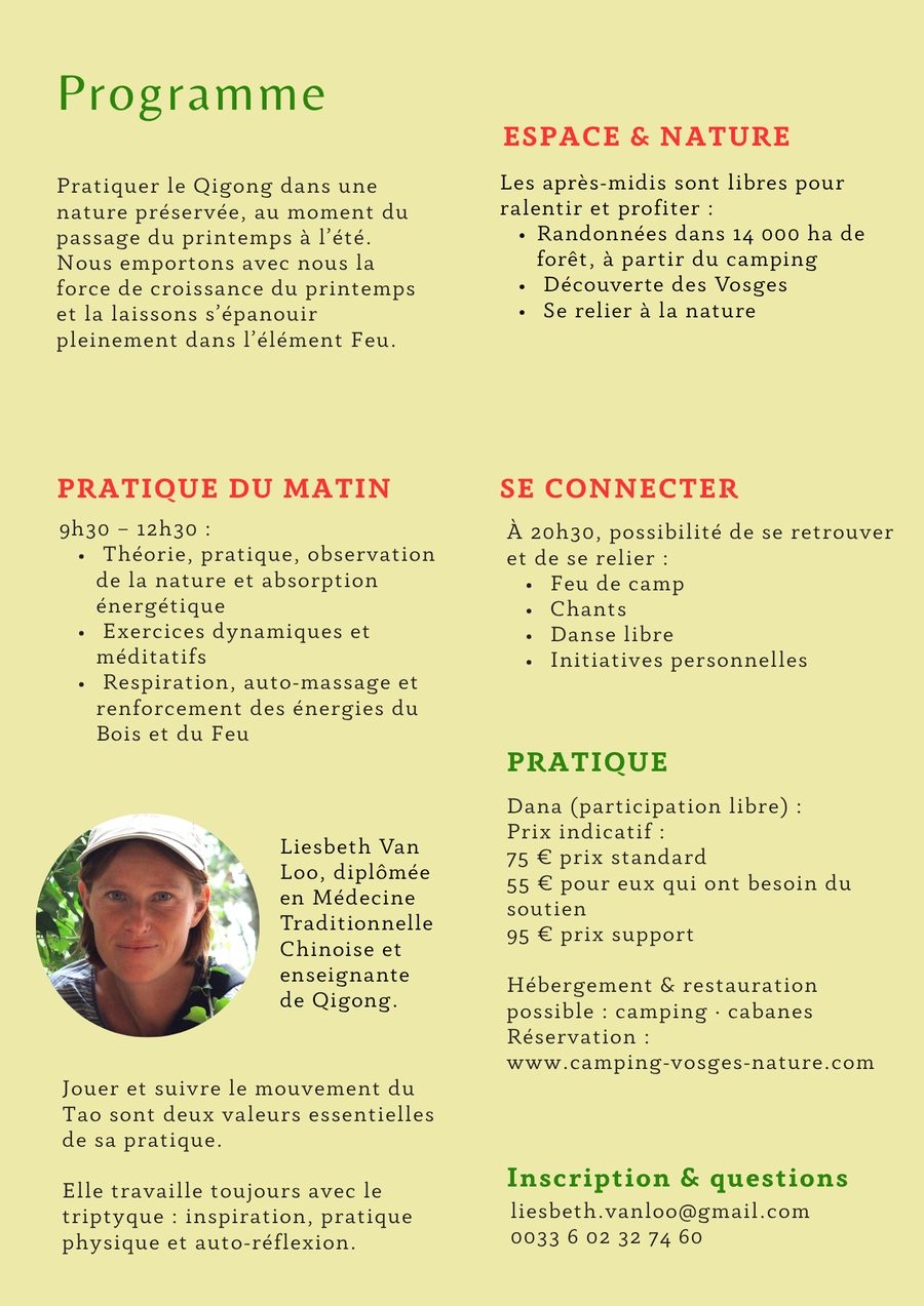 Du 12 au 14 juin 2026, le camping du Verbamont accueillera un stage de Qi Gong en plein air (9 h30 à 12 heures)